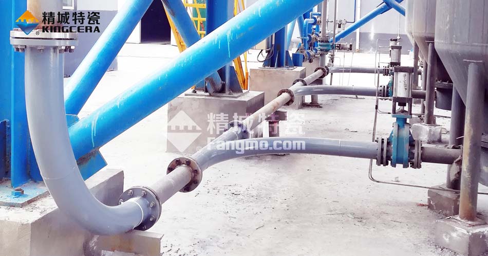 現(xiàn)如今使用精城牌耐磨陶瓷片作為內(nèi)襯材料,優(yōu)點突出,耐磨陶瓷片本身硬度高,韌性強,很規(guī)則,每小塊之間用膠粘接,每一圈陶瓷片都進行錯位粘貼,做到無縫隙,杜絕瓷片間縫隙處被磨漏。管件之間的對接采用法蘭連接,便于安裝和更換,現(xiàn)已取得了良好的效果。