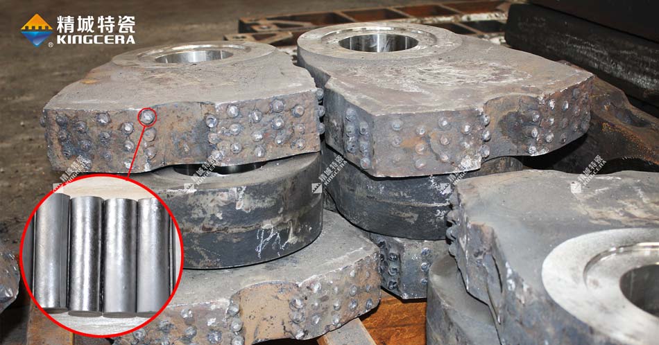 碳化鈦基金屬陶瓷棒是以碳化鈦(TiC) 為硬質(zhì)相,高錳鋼及其他金屬粉末為粘結(jié)相,再適當(dāng)配入相應(yīng)的合金元素,用粉末冶金方法生產(chǎn)的一種硬質(zhì)合金材料,可廣泛應(yīng)用于礦山,水泥、制砂等各種沖擊工況行業(yè)等,其中牌號TM52被廣泛應(yīng)用在破碎機(jī)耐磨件上,采用熔融的高錳鋼液澆鑄,將合金棒鑲鑄在耐磨件的工作面,二者產(chǎn)生牢固的冶金結(jié)合,制備成復(fù)合耐磨件,有效減少了基體材料高錳鋼的磨損,維修量和更換量顯著減少,從而降低了備件費(fèi)用,提高了破碎比和出料率。
