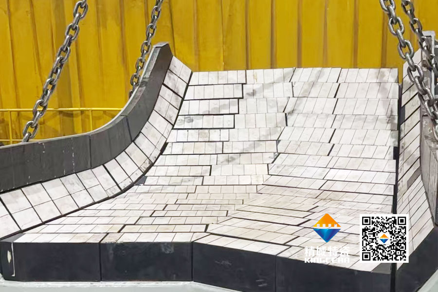 ZTA陶瓷襯板尺寸問題。原來,該料斗為多曲面結(jié)構(gòu),陶瓷襯板厚度達到了112mm,襯板與襯板之間相互交角,我司設計陶瓷產(chǎn)品時采用了先進的三維放樣技術(shù)多次校驗,確保了設計與成品的精準無誤。然而,多曲面設備厚陶瓷襯板安裝時安裝有嚴格的順序要求,就像拼積木一樣,稍有不慎便可能導致無法順利安裝,這才是此次安裝問題的根源。